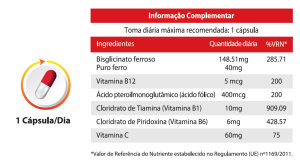 Ingredientes: Bisglicinato ferroso, vitamina B12 (cianocobalamina), Vitamina B9 (ácido fólico), vitamina B1 (tiamina cloridrato), vitamina B6 (piridoxinacloridrato), vitamina C (ácido L-ascórbico). Agente de volume (celulose microcristalina, milho amido, hidroxipropilmetilcelulose, maltodextrina), cápsula (gelatina), agente de revestimento (goma-laca, etilcelulose).