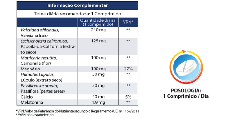 Agente de volume: Celulose; Valeriana (Valeriana officinalis L.) raiz; Magnésio (Óxido de magnésio); Papoila-da-Califórnia (Eschscholtzia californica Cham.) extrato seco (4:1) da planta; Cálcio (Carbonato de cálcio); Camomila (Matricaria recutita L,) flor; Lúpulo (Humulus lupulus L.) extrato seco (10:1) do estróbilo com 4% de flavonas; Passiflora (Passiflora incarnata L.) partes aéreas; Agente de volume: Fosfato de cálcio; Agentes de revestimento: Hidroxipropilmetilcelulose, Dióxido de titânio, Polidextrose, Talco, Polietilenoglicol, Óxido de ferro vermelho; Antiaglomerante: Sais de magnésio de ácidos gordos; Melatonina.